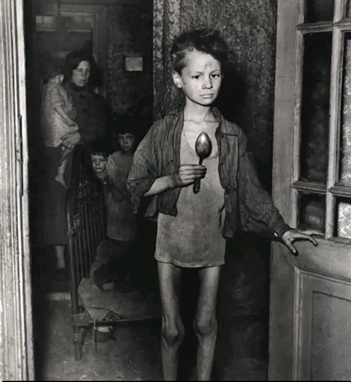 Bu fotoşəkil 1944–45-ci illərin “Aclıq Qışı” zamanı çəkilmişdir. O vaxt Niderlandın qərb hissəsi nasist işğalı altında idi və ərzaq tədarükü tamamilə kəsilmişdi. Dəmir yolu tətili və almanların sərt cəzaları nəticəsində milyonlarla holland mülki əhali aclıq içində qaldı. Tarixdə ən soyuq qışlardan biri idi. Arıq və yalınayaq uşaq əlində bir qaşıq tutur — ümidsizlik içində sadə bir ümid rəmzi. Onun arxasında ailəsi səssizcə gözləyir, aclıqdan çökmüş sifətləri ilə.