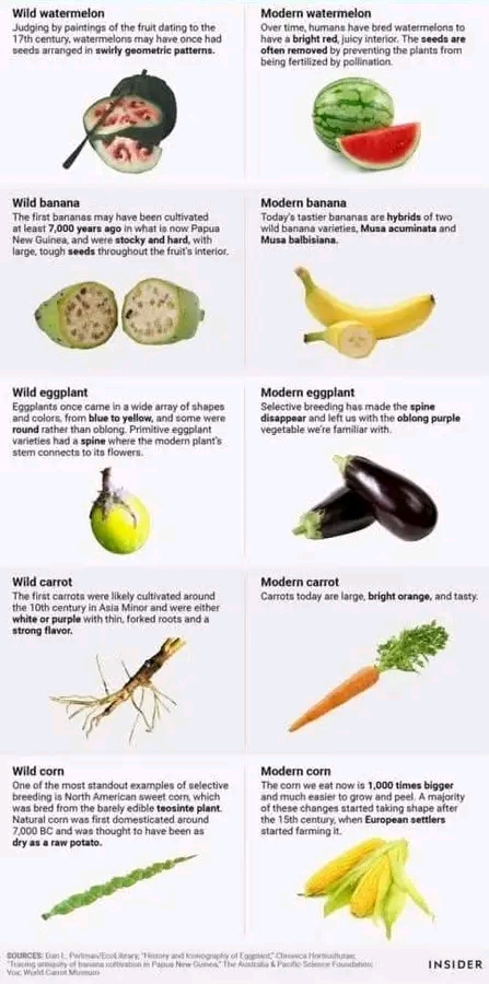 Məsələn: 50-60 il öncəyə qayıtsaydıq indi gördüyümüz banan, qarpız, badımcan və s kimi tərəvəzlərin tamamilə fərqli olduğunu görəcəkdik. Onlar müasir dövrdə dəyişdirilib, müasir forma alıb.