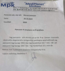 Lalə Əliyeva deyir ki, oğlu həqiqi hərbi xidmətə yararlı deyil və bunu həkim-eksert rəyləri də, hərbi çağırış idarəsinin komissiyası da təsdiqləyib. “2000-ci il təvəllüdlü oğlum Babaşov Murad İslam oğlu 2021-ci ildə həqiqi hərbi xidmətə çağırıldı. Amma ayağında problem olduğuna görə ona 3 illik möhlət verildi. Oğlumun ayağında III dərəcəli yastıpəncəlilik var. 2024-cü ilin oktyabr ayında yenidən həqiqi hərbi xidmətə çağırıldı. Səfərbərlik və Hərbi Xidmətə Çağırış üzrə Dövlət Xidmətinin Yasamal Rayon İdarəsinin komissiyasından növbəti dəfə də keçdi və yenə də əsgərliyə yararsız çıxdı, növbəti dəfə də bildirildi ki, onun ayaqlarında III dərəcə yastıpəncəlilik var. Sonra bizi Əmək və Əhalinin Sosial Müdafiəsi Nazirliyinin Dövlət Tibbi-Sosial Ekspertiza və Reabilitasiya Agentliyinə göndərdilər..