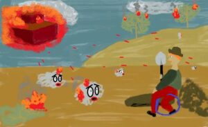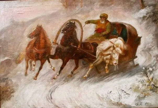 “Üstüörtülü araba”, yaxud elə “kibitka” (кибитка) sözünü uçan boşqab zənn edən şagird “xovlu cilov”u (bizimkilər tərcümədə “qamçı” yazıblar) nəsə qəribə tüklü mifik varlığa bənzədib. Şəkildə hələ o varlığın partlayıb yandığını da təsvir edib. “Yamçı” (ямщик) sözünü çuxur qazan adam hesab edən şagird onun buludlar üzərində (“облучка” əslində “qozla” deməkdir, faytonda sürücü oturan yerə deyilir) uçduğunu çəkib. Aşağıda iki şəkil var: biri kitaba çəkilən illüstrasiyalardan biridir, digəri isə şagird təxəyyülünün “bəhrə”sidir.