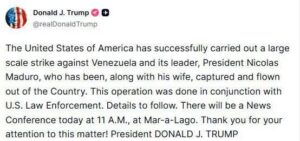 DünyaGündəmHadisəMuharibə“ABŞ Maduronu həbs etdi” – D. Tramp 03 Yanvar 2026 13:4203 Yanvar 2026 15:00Paylaş0 “ABŞ Venesuela və onun lideri Maduroya qarşı genişmiqyaslı əməliyyatı uğurla həyata keçirib. Maduro həyat yoldaşı ilə birlikdə tutularaq ölkədən çıxarılıb. Bu əməliyyat ABŞ hüquq-mühafizə orqanları ilə birgə həyata keçirilib”. Donald Tramp Tacxeber.com Bizimlə əlaqə: [email protected]