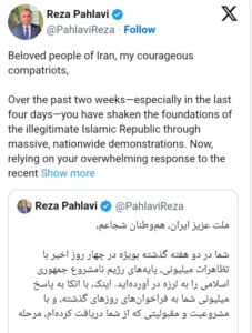 İranın sonuncu şahının oğlu Rza Pəhləvi “milli üsyanın yeni mərhələsinin” başladığını elan etdi. O, ölkə daxilində iki həftə davam edən genişmiqyaslı etirazlar fonunda X platformasında təcili çıxış etdi.