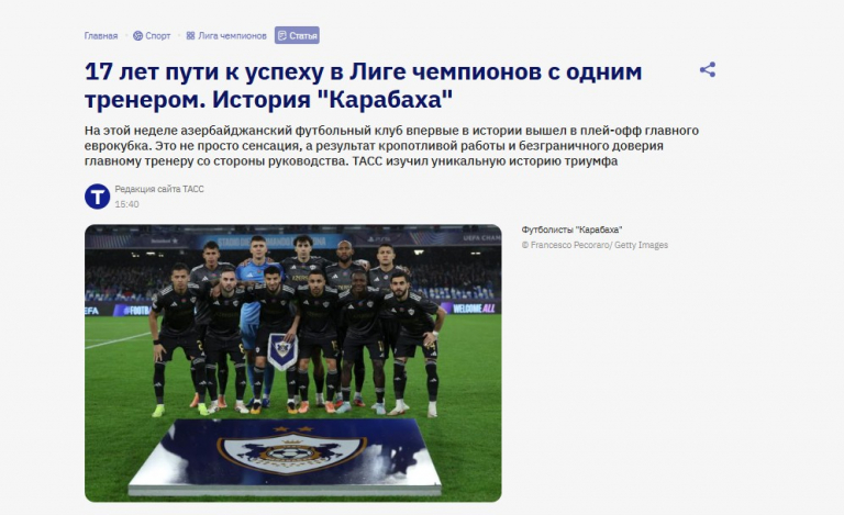 TASS həmçinin “Qarabağ”ın əvvəlki Avropa uğurlarını – müntəzəm olaraq Avropa Liqasının qrup mərhələsinə çıxmasını, Avropanın ən yaxşı klubları ilə qarşılaşmasını və pley-offa çıxmasını xatırladaraq, hazırkı Çempionlar Liqasındakı uğurlarının təsadüfi olmadığını vurğulayır. Agentlik Çempionlar Liqasının pley-off mərhələsinə yüksəlməyin illərlə davam edən sistemli işin məntiqi nəticəsi olduğunu və “Qarabağ”ın hazırkı nailiyyətlərinin klub tarixində yeni bir fəslin başlanğıcı ola biləcəyi qənaətinə gəlir.