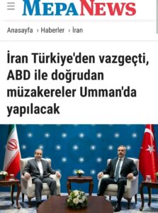 Razılaşdılar ki, bu cümə günü ABŞ-İran-Türkiyə üçlüyündə, İstanbulda görüş, danışıqlar olsun. Və bu gün, İran bu görüşə ikicə gün qalmış, heç gözlənilmədən ABŞ-a ayrıca müraciət etməklə Türkiyə vasitəçiliyindən və həm İstanbul görüş yerindən imtina etdi və təkidlə də Omanı seçdi.