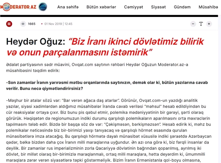 Dəyərli dostlarım, bu ölkədə, bəlkə də regionumuzda ABŞ-İran müharibəsini ən az arzulayan mənəm və bu barədə fikirlərimi müxtəlif media orqanlarına verdiyim açıqlamalarda, qələmə aldığım yazılarda dəfələrlə dilə gətirmişəm. Məsələn, Moderator.az-ın 01 Noyabr 2019-cu il tarixli buraxılışında dərc olunan müsahibəmdə belə deyirəm: “ABŞ və sionizm bizim ikinci vətənimiz bildiyimiz İranı parçalamaq istəyirlər. Bu istəyin bizə dəxli yoxdur. Biz İranı ortaq dövlətimiz bilirik və onun parçalanmasını qətiyyən istəmirik. Vahid Azərbaycan deyəndə də əsla və əsla ordakı param-parça edilmiş ostanlıqların İrandan ayrılıb bizə birləşməsini nəzərdə tutmuruq. Bizim düşüncəmizdəki Vahid Azərbaycan İranın demokratikləşməsi və ordakı soydaşlarımızın milli azadlığa qovuşmasıdır. Bu baş verərsə, İran bütünlüklə Azərbaycan olacaq. Hansı ağılsız özündən bir parçanın ayrılmasını istəyər?”.
