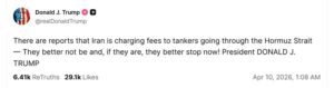 “Bəzi məlumatlara görə, İran Hörmüz boğazından keçən tankerlərdən rüsum alır. Bunu etməməyi daha yaxşı olardı, əgər edirsə, bunu elə indicə dayandırması yaxşı olardı! Prezident DONALD J TRAMP”