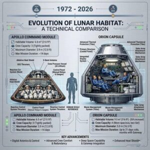 1972-ci ildə Ay səfəri üçün istifadə olunmuş “Apollo Command Module” öz dövrü üçün yüksək səviyyəli mühəndislik xariqəsi idi. Bu modul qısa müddətli, yüksək riskli Ay missiyaları çərçivəsində üç astronavt üçün nəzərdə tutulmuş kompakt yaşayış və idarəetmə mühiti təmin edirdi. Məhdud daxili həcm, sadələşdirilmiş sistemlər və yalnız əsas funksiyaları yerinə yetirmək üçün kifayət edən infrastruktur bu kapsulun xarakterik xüsusiyyətləri idi.